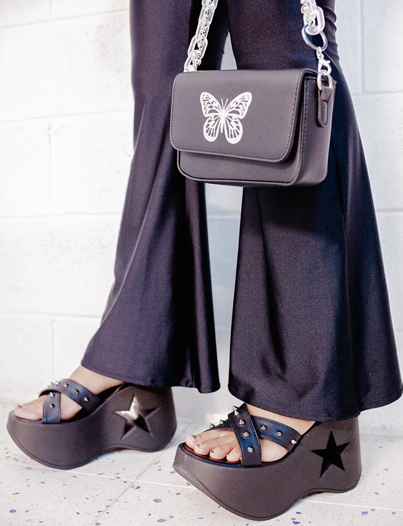 The sweetest platforms we ever did see!Ā These all black sandal platforms come with a cute star cut out wedge heel and spiky studded straps. you won't want to take these sandals off this summer!